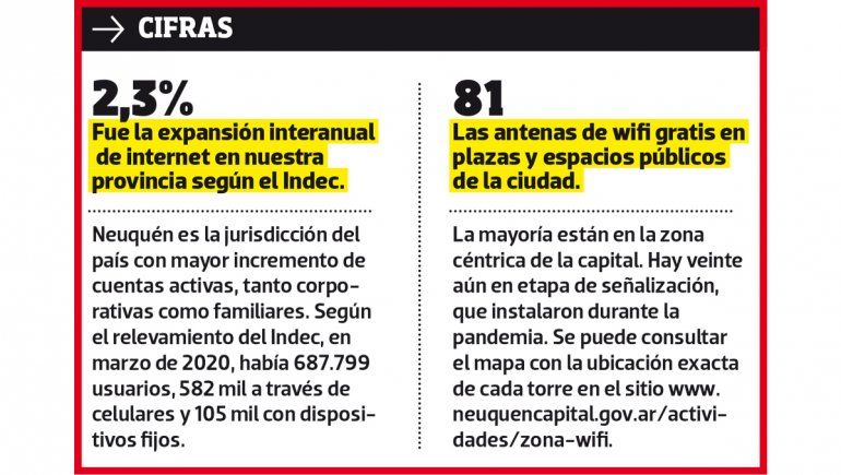 A fines de 2016, dentro del aglomerado de la capital neuquina y Plottier, el 60,8 por ciento de los hogares contaba con algún servicio de internet. Al año siguiente, eran siete de cada diez. En 2018, la cobertura llegó a un 77 por ciento de las familias y, para el último cuatrimestre de 2019, saltó al 89 por ciento.