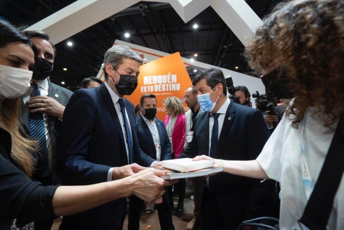 En su salida a la cancha contó con el apoyo del gobernador, quien recorrió con él la FIT, y también estuvo con el ministro de Turismo de la Nación, Matías Lammens, en una rápida visita al stand de Neuquén.