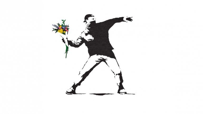 La obra, que se llama Love is in the air (“El amor está en el aire”), se hizo conocida en el mundo como “Flower Thrower” (“El arrojador de flores”) y es una pintura con técnica de esténcil que apareció en 2003 sobre el muro de una entidad bancaria en la ciudad de Jerusalén. Quienes la interpretan afirman que se trata de un mensaje de paz: el amor y la serenidad que transmiten las flores, en el cuerpo tenso de un manifestante.