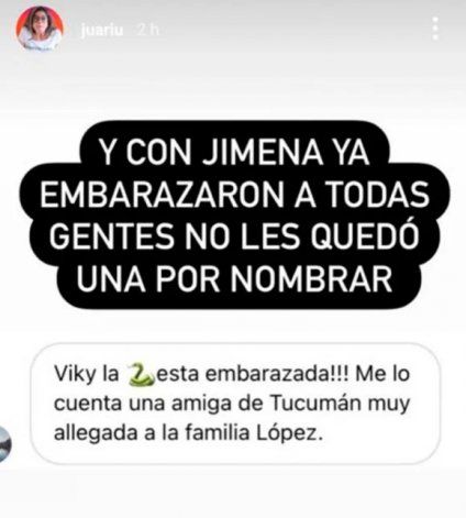 Luego, fue Juariu quien compartió el mensaje de una mujer contándole que Jimena estaría embarazada: “¡¡La cobra está embarazada!! Me lo cuenta una amiga de Tucumán, muy allegada a la familia López”.