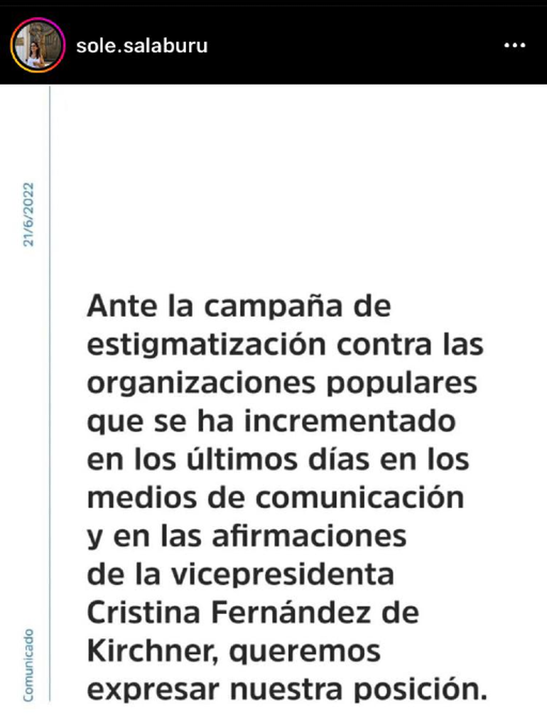 “Desde Barrios de Pie Neuquén repudiamos los comentarios de menosprecio que Cristina Fernández realizó sobre el rol de las mujeres de las organizaciones sociales”, dijeron desde la organización en un comunicado.