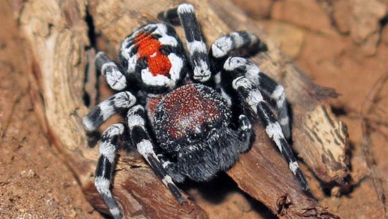 "Loureedia phoenixi", la araña tiene pelo fino negro en la mayor parte de su cuerpo con una línea roja brillante en su espalda y manchas blancas en cada punta.