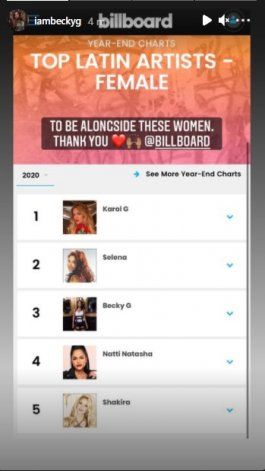 El éxito de Becky G no solo se extiende a su Spotify también lo hace en la cartelera de los Billaboard como una de las artistas femeninas del año privilegio que comparte con Shakira, Jennifer López, Karol G, Selena y Natti Natasha.