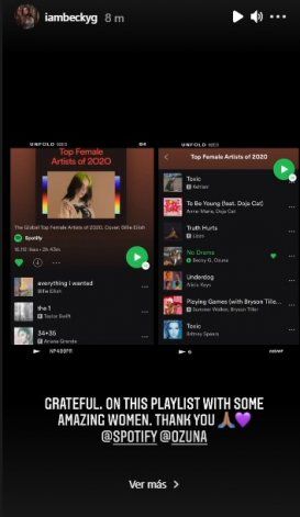 Pero además Becky también tiene más cosas que celebrar porque también es una de las artista femeninas con más reproducciones en la lista de la plataforma de streaming, listado que comparte con estrellas de la lista A como Billie Eilish, Arianna Grande, Taylor Switf y Britney Spears.