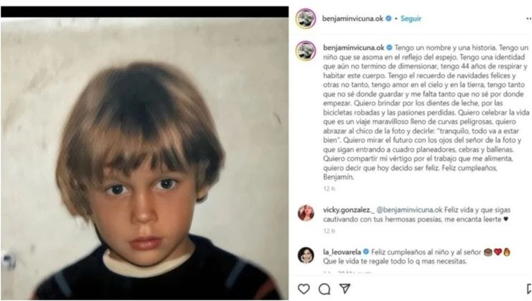 "Quiero abrazar al chico de la foto y decirle: 'tranquilo, todo va a estar bien'. Quiero mirar el futuro con los ojos del señor de la foto y que sigan entrando a cuadro planeadores, cebras y ballenas. Quiero compartir mi vértigo por el trabajo que me alimenta, quiero decir que hoy decido ser feliz", escribió antes de cerrar con un: "Feliz cumpleaños, Benjamín".