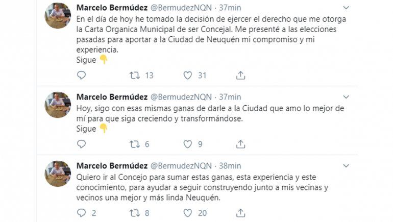 Este domingo por la tarde, al respecto, Bermúdez enfatizó que "me presenté a las elecciones pasadas para aportar a la Ciudad de Neuquén mi compromiso y mi experiencia" por lo que"he tomado la decisión de ejercer el derecho que me otorga la Carta Organica Municipal de ser Concejal".