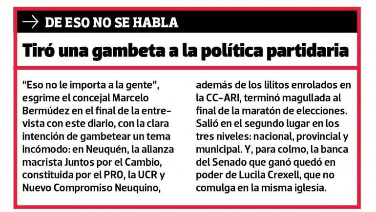 Hay que ser, no solo parecer. Marcelo Bermúdez hace gala de su inclinación de centroderecha en su reingreso al llano de la política después de haber domado el poder municipal en los años de ejercicio junto al caudillo radical Horacio “Pechi” Quiroga. El líder provincial del PRO consideró que el intendente Mariano Gaido no podrá mantener el ritmo de obras públicas porque se gastará la plata en la planta política de la comuna.