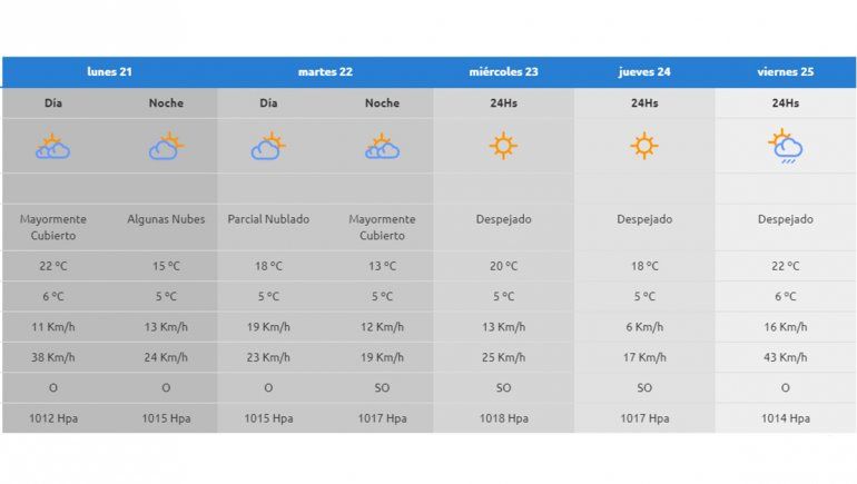El jueves, la temperatura variará entre 5°C y 18°C. El cielo se seguirá mostrando despejado. Por último, el viernes, se espera una jornada inestable, con probabilidades de lluvias. Ese día, la máxima será de 22° y la mínima de 6°C. Además, también están pronosticadas ráfagas de viento de hasta 43 km/h.