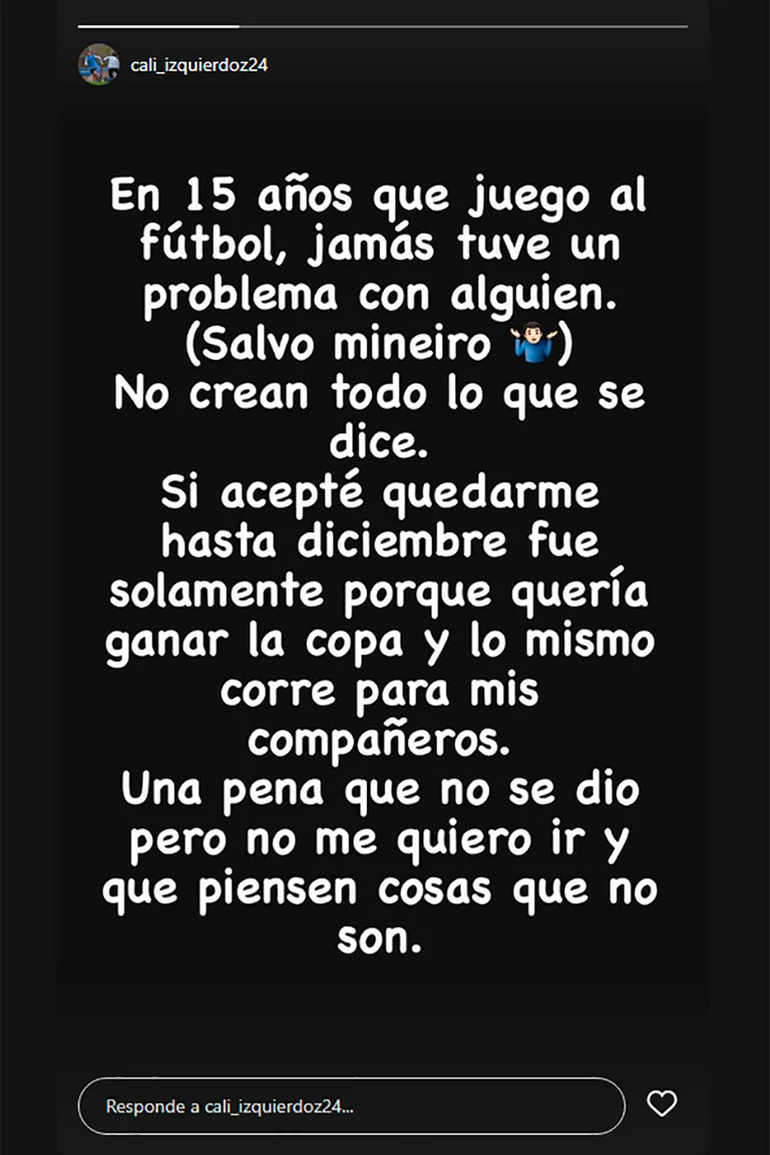 "En 15 años que juego al fútbol jamás tuve un problema con alguien (salvo Mineiro). No crean todo lo que se dice", expuso Izquierdoz desde su cuenta en la red social Instagram.