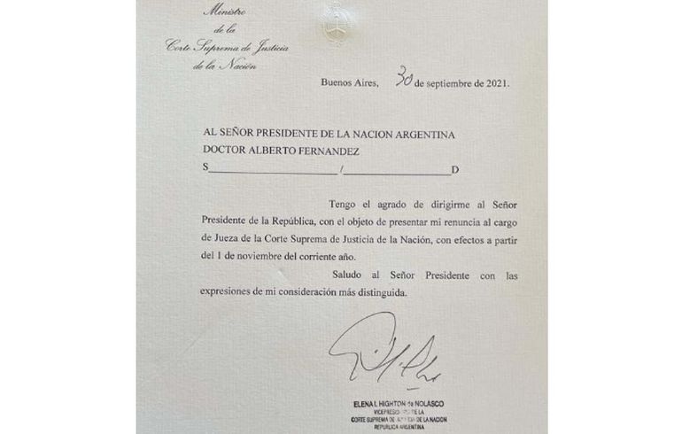 En el texto de su renuncia, de un párrafo, Highton no explica los motivos de su decisión, pero dice que la dimisión es “con efectos a partir del 1 de noviembre del corriente año”. Pese a que la presentó hoy, la renuncia lleva por fecha “30 de septiembre”.