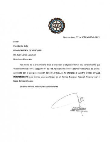 Pues bien, ahora la noticia es que llegó la invitación del Consejo Federal para un equipo de la región y se trata nada menos que de Independiente de Neuquén.