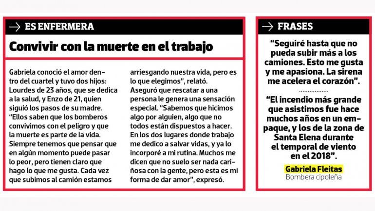 Gabriela contó que este año cumple 25 años de servicio en el cuartel cipoleño y que ya estaría en condiciones de pasar a retiro, aunque todavía no planea hacerlo. “Seguiré hasta que no pueda subir más a los camiones; esto me gusta y me apasiona. La sirena me acelera el corazón. Saber que vas a salir corriendo a salvar a alguien es emocionante”, relató.