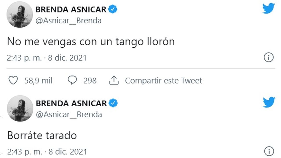 "No me vengas con un tango llorón" tuiteó la actriz, para luego agregar "Borrate tarado". Los enigmáticos mensajes llegaron luego de que los creadores de "Como si no importara" se mostraran muy enamorados en una selfie a los besos.
