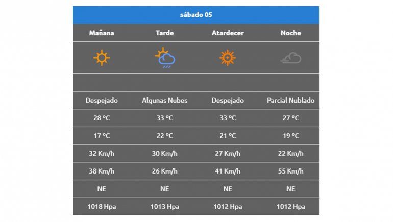 Para el sábado, la temperatura estará en ascenso con mínimas pronosticadas de 17°C y una máxima, que se sentirá por la tarde de 33°C.