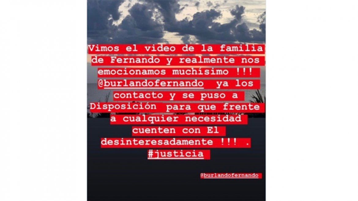 La noticia la anunció la modelo Barby Franco, pareja de Burlando a través de sus redes sociales: "Vimos el video de la familia de Fernando y realmente nos emocionamos muchísimo. Burlando ya los contactó y se puso a disposición para que frente a cualquier necesidad cuenten con él desinteresadamente. Justicia".