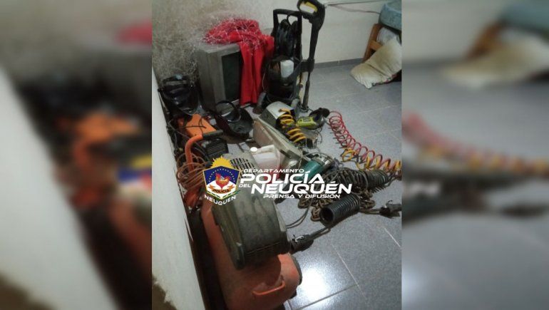 Allí, con la colaboración del Departamento Delitos Contra la Propiedad, se halló una motosierra, una soldadora, dos amoladoras, tres televisores de 32'', 39 y 50'', una hidrolavadora, un compresor, un taladro, tres máscaras de soldar, una bicicleta rodado 29, una torre de sonido, un kayak, y otros elementos de interés para la causa.