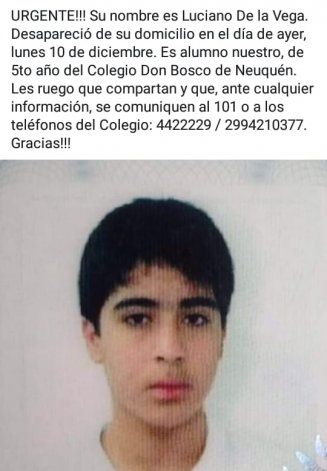 El alumno de 18 años está identificado como Luciano De la Vega y ante cualquier información se pueden comunicar a los teléfonos de la escuela: 4422229/ 2994210377.