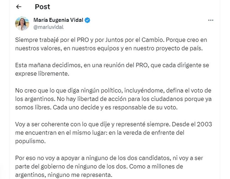 La exmandataria de la provincia de Buenos Aires dijo que no cree que ningún político defina el voto de los argentinos. E indicó que se mantendrá coherente con lo que representó en estos años. “Desde el 2003 me encuentran en el mismo lugar: en la vereda de enfrente del populismo. Por eso no voy a apoyar a ninguno de los dos candidatos, ni voy a ser parte del gobierno de ninguno de los dos. Como a millones de argentinos, ninguno me representa”.