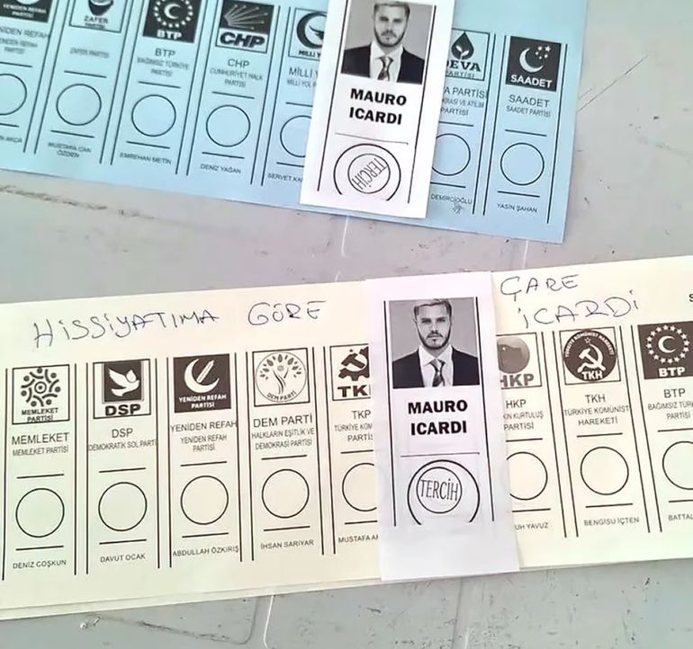 El fanatismo por Mauro Icardi en el Galatasaray es tal que durante las recientes elecciones municipales en Turquía, la figura del delantero argentino Mauro Icardi sorprendió al emerger en las boletas electorales como una manifestación singular de admiración. En un gesto inesperado, un hincha de Galatasaray incluyó la imagen de Icardi en su sobre electoral, acompañada por la frase: "Según mi sentimiento, el remedio es Icardi".