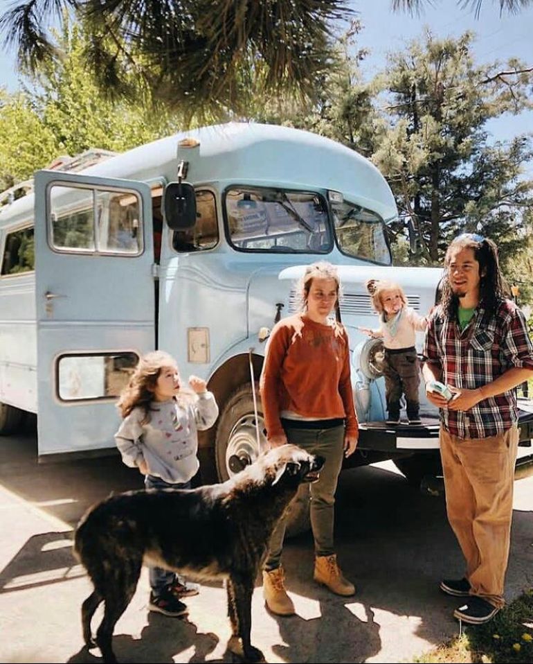 Dos años antes de la pandemia, Mexi y Mani cerraron el taller que tenían en la casa y lo volvieron itinerante. Guardaron lo importante, armaron sus bolsos, acondicionaron un colectivo y se fueron a viajar por ahí junto a su pequeña hija Charo, que entones tenía sólo 1 año, y con sus dos perras, Auca y Carmela. Mexi cuenta muy feliz que intermitentemente la familia se agrandaba cuando se les unían sus hijos mayores Frida y Mateo.