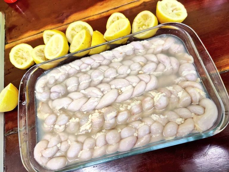 Una presentación muy frecuente es el chinchulín trenzado. En este caso, debe sacarse la grasa blanca que acompaña a la tripa. Se toma un extremo de la tira y con el filo del cuchillo se va retirando toda la grasa. Queda la tripa limpia.
