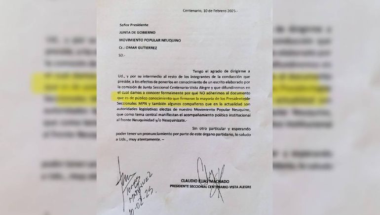 Respecto a la adhesión de los referentes del MPN al armado de Rolando Figueroa, el presidente de la seccional VII, Claudio Machado envió una nota dirigida a Omar Gutiérrez como autoridad partidaria, que hasta hoy no se expresó orgánicamente sobre el apoyo a Figueroa. Y expresó que muchas de las 20 seccionales que firmaron, lo habrían hecho "bajo presión", incluso con la firma de los vicepresidentes.