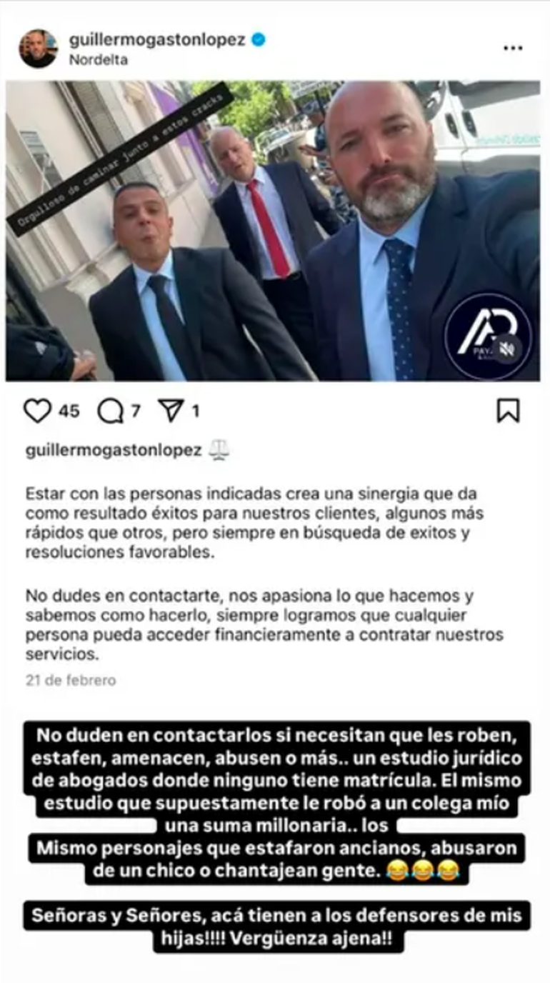 En un impulso por defender públicamente a su pareja, Icardi publicó una imagen del estudio de abogados Payarola, en la que también aparece López, y los acusó de “estafadores” y “mala gente”. Además, sostuvo que algunos de los profesionales estarían ejerciendo sin matrícula. Pero lejos de dejar el tema solo en el ámbito de las redes, el futbolista advirtió que llevará el caso a la Justicia.