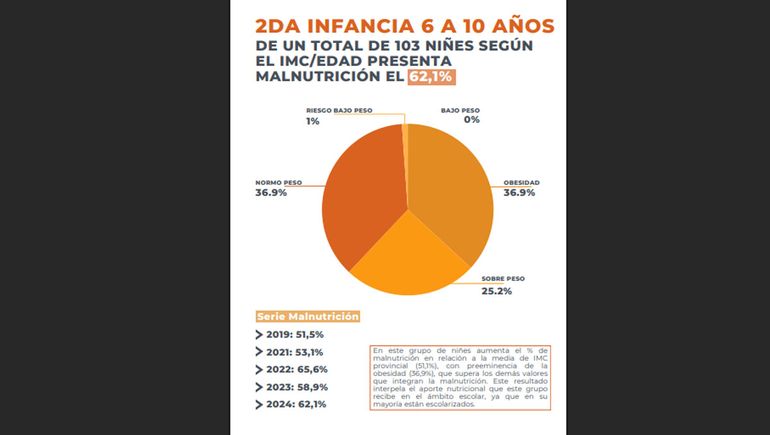 “Los resultados son bastante alarmantes, más de la mitad de este universo objetivo presenta malnutrición; en la mayoría de los casos se expresa en sobrepeso y obesidad”, detalló Lamarca. Sobre la desnutrición señaló que “es un número pequeño; llega a un 2%, que también es alarmante, porque este número se ha duplicado del año pasado a este”.