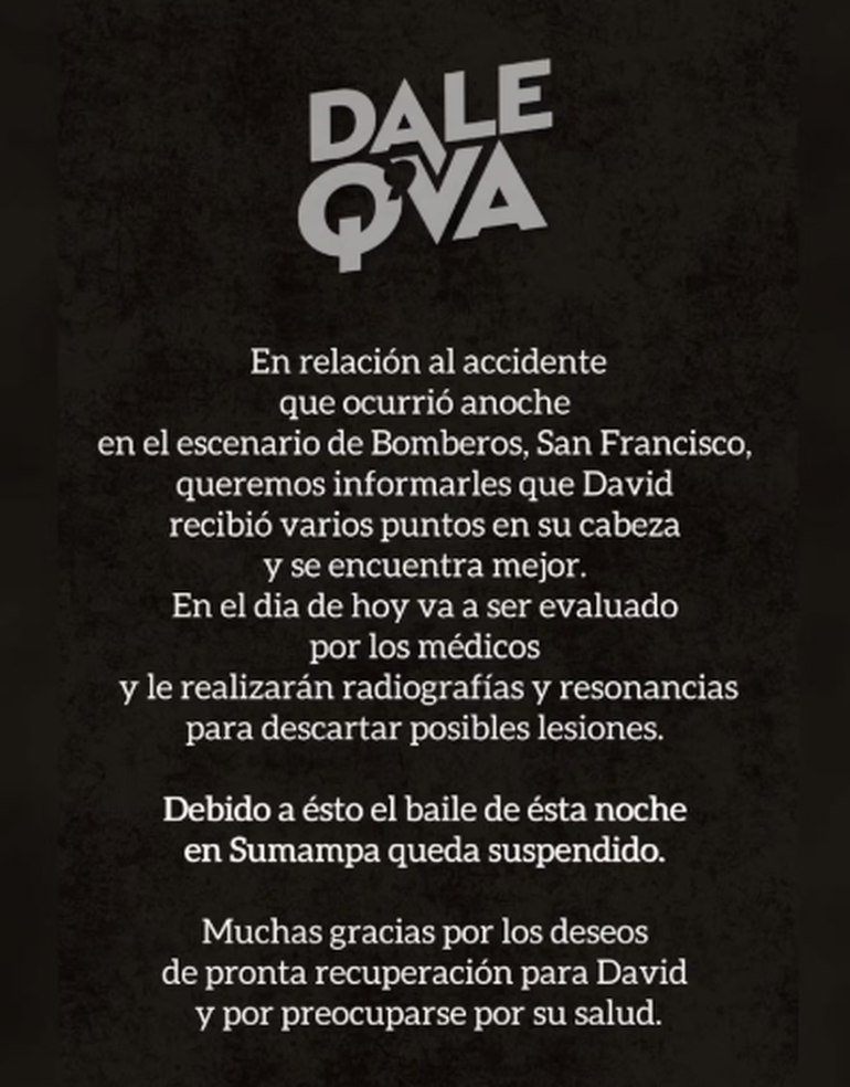 Según se puede divisar en un video compartido en las redes sociales pareciera que cuando da el segundo saltó las tablas se vencieron y es por eso que cayó unos centímetros. Una vez más calma la situación, la banda de música lanzó un comunicado en sus redes sociales. "Informamos que David recibió varios puntos en la cabeza y se encuentra mejor. Hoy será evaluado por los médicos y le realizarán radiografías y resonancias para descartar posibles lesiones. Agradecemos los deseos de pronta recuperación para David y la preocupación por su salud", escribieron.