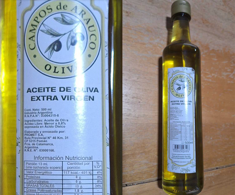 ANMAT comprobó irregularidades en el rotulado y en los registros sanitarios del aceite de oliva extra virgen Campos de Arauco - Oliva, por lo que ordenó a través de Boletín Oficial, su inmediata prohibición de elaboración, fraccionamiento y comercialización.