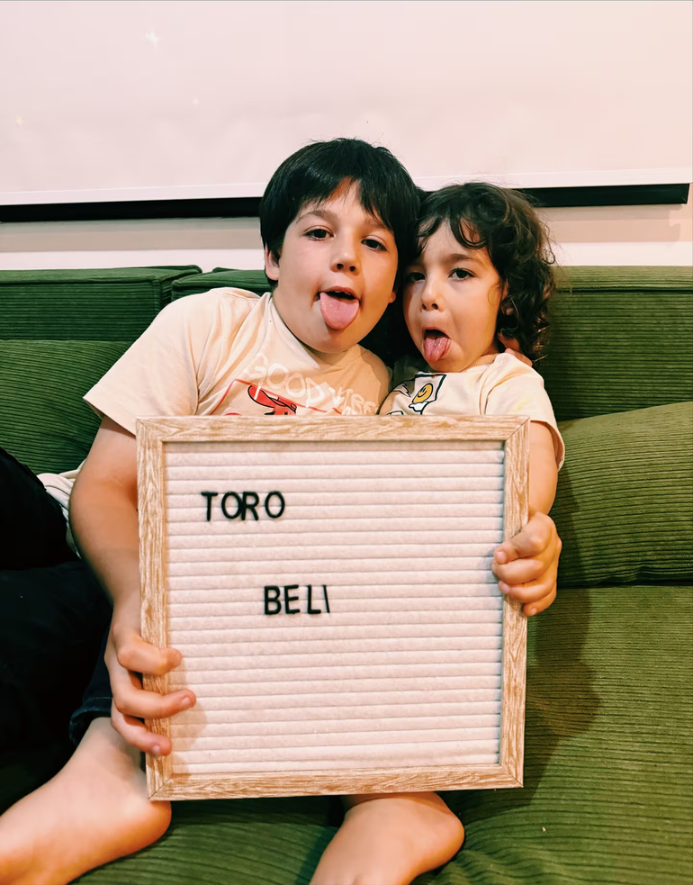 Con su característico sentido del humor humor e inocencia, Juana Repetto volvió a enternecer a sus seguidores en Instagram. La actriz publicó una imagen que derritió corazones: sus hijos mayores, Toribio y Belisario, posando juntos con un cartel que lleva sus apodos, “Toro” y “Beli”.