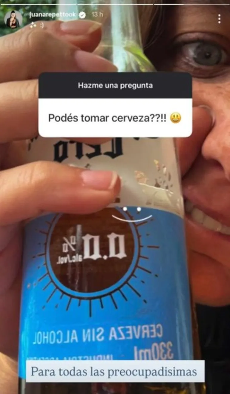 En medio de la filmación, los usuarios divisaron una botella de cerveza sobre la mesa por lo que salieron al cruce de la actriz. Sin embargo, fue la propia Juana en despejar las sospechas y frenar los ataques mostrando que era cerveza sin alcohol: “Para todas las preocupadísimas”.