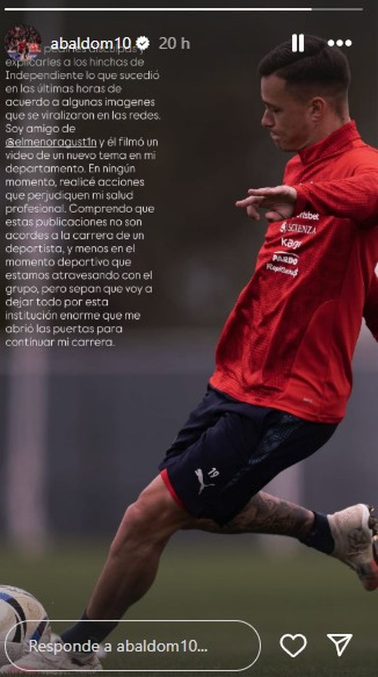 Fue el uruguayo Matías Abaldo quien tuvo que frenar las críticas y dar explicaciones sobre lo ocurrido para desligarse de responsabilidades. “Quería pedirles disculpas y explicarles a los hinchas de Independiente lo que sucedió en las últimas horas de acuerdo a algunas imágenes que se viralizaron en las redes", comenzó escribiendo el futbolista.