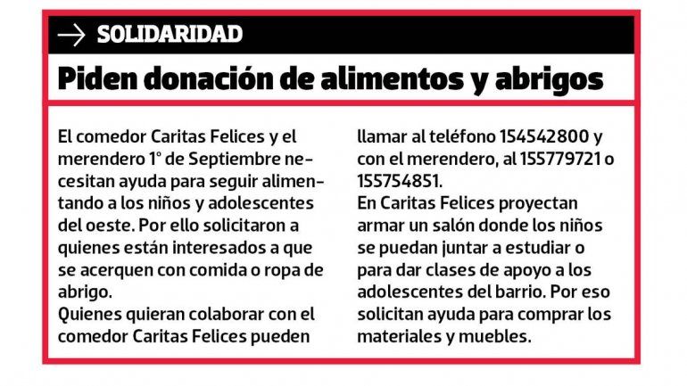 La crisis no sólo se extiende a los vecinos, sino también a los propios comedores y merenderos porque cada vez reciben menos donaciones. “Estamos necesitando todo tipo de mercadería para cocinar, al igual que ropa de abrigo para los chicos”, pidió.