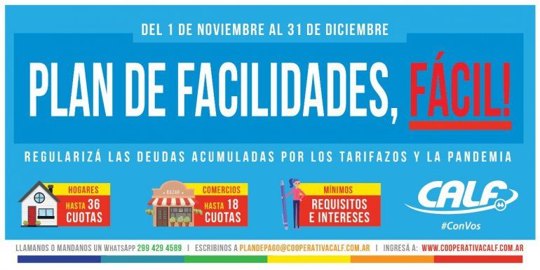 También se pueden consultar las características de este plan de facilidades por Whatsapp al número 299 429-4589 o bien enviar un mail a la casilla [email protected]