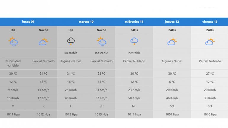 El miércoles (otro día inestable) la máxima será de 30°C y la mínima de 12°C. El cielo se mostrará “parcialmente nublado” y las ráfagas de viento promediarán los 50 km/h.