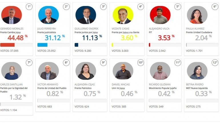 El gobernador Gerardo Morales (Cambiemos) le dio este domingo su primera victoria electoral en lo que va del año al gobierno de Mauricio Macri, al ser reelecto en Jujuy con el 43,63 por ciento de los votos, una ventaja de casi 11 puntos sobre Julio Ferreya, el candidato de un sector del peronismo que compitió en esta elección con una fragmentación inédita.