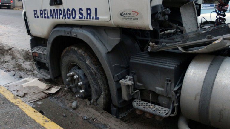 El camión transitaba por la calle Salta, cerca de la 1 de la madrugada de este viernes, cuando cayó en la ranura de una obra privada que quedó inconclusa y estaba tapada con tierra. La misma se ubicaba en el tramo entre Carlos H. Rodríguez y Roca.