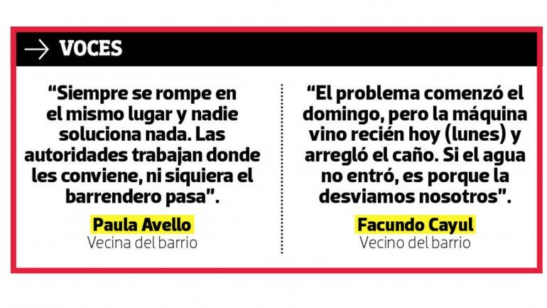 Según comentaron a este medio, en ese sector del barrio -ubicado frente a la EPET 3- los caños se rompen periódicamente y es común que también haya derrames cloacales, y aseguraron que tanto el EPAS como el Municipio ponen parches y no brindan una solución de fondo. “Por una cosa o por la otra, siempre hay agua en esta esquina. Los vecinos ya están cansados”, detalló Claudio Toranzo, que vive en la zona.
