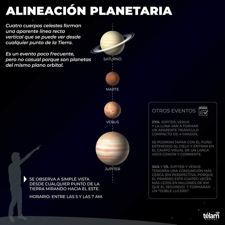 Por su parte, Mariano Ribas, responsable del área de divulgación científica del Planetario de la Ciudad Autónoma de Buenos Aires remarcó: “La observación de los planetas no es algo raro, se ven a simple vista siempre, lo interesante es que (ahora) están formando una zona compacta en el cielo y en un solo golpe de vista ves a los cuatro, cuestión que en otro momento quizá te lleva toda la noche”.