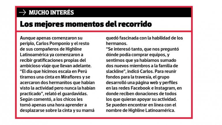 Así, al igual que tensan una cuerda entre dos puntos fijos para hacer equilibrio, Carlos y sus compañeros planean tender sogas entre los distintos países de América, en la creación de una red imaginaria que ellos llaman “la ruta del hihghline” y que une a los apasionados del deporte con los que recién descubren la actividad y que provienen de distintas geografías.