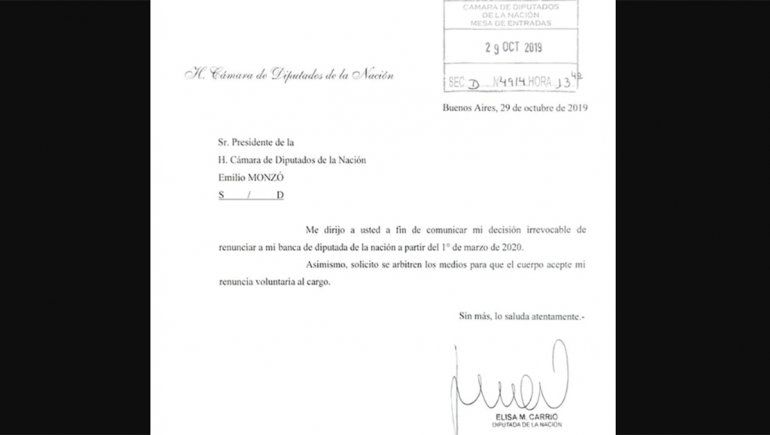 Según la nota nota que presentó con su firma ante el presidente del cuerpo, Emilio Monzó, “Lilita” le solicitó que arbitre los medios necesarios para que el cuerpo acepte su renuncia voluntaria al cargo. "Me dirijo a usted a fin de comunicar mi decisión irrevocable de renunciar a mi banca de diputada de la nación a partir del 1° de marzo de 2020", pidió la lagisladora.