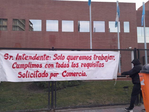 "Señores concejales es un pedido inconstitucional. Basta de ordenanzas autoritarias", "150 puestos directos de trabajo neuquino", "Basta de persecución política. Solo queremos trabajar", "Señor intendente solo queremos trabajar, cumplimos con todos los requisitos solicitados por Comercio", dicen los carteles que están en la vereda del Concejo Deliberante.