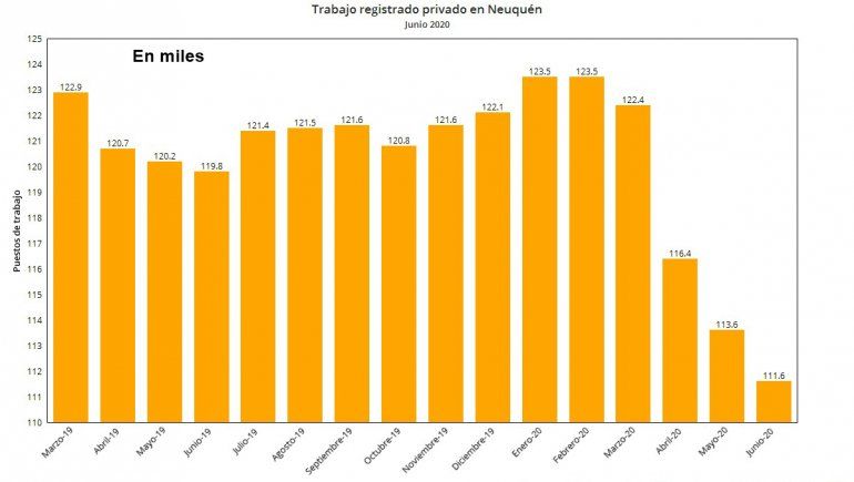 Entre mayo y junio se perdieron 2000 puestos de trabajo del sector privado registrado de la economía neuquina. Son 10.800 los empleos destruidos mientras transcurrió la cuarentena en sus diversas fases. Las restricciones por la pandemia comenzaron el 20 de marzo. Ese mes había 122.400 empleados en blanco en las empresas de la provincia. En junio, la masa había mermado hasta los 111.600, la menor cantidad de trabajadores registrados desde enero de 2018. En mayo eran 113.600 y en abril, 116.400. El universo de trabajadores registrados saltó de 122.100 a 123.500 entre diciembre y enero, se mantuvo en febrero y cayó en marzo.