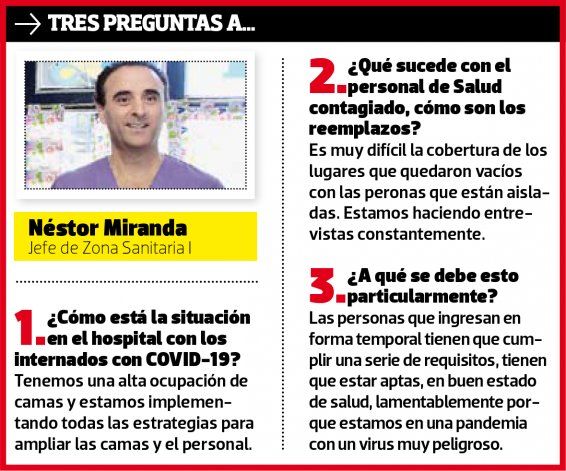 Uno de los inconvenientes hoy en el nosocomio es la cantidad de enfermeros y médicos que contrajeron el virus y que permanecen en aislamiento y recuperación en sus domicilios. Son más de una decena, pero el número aún no complica demasiado la atención.