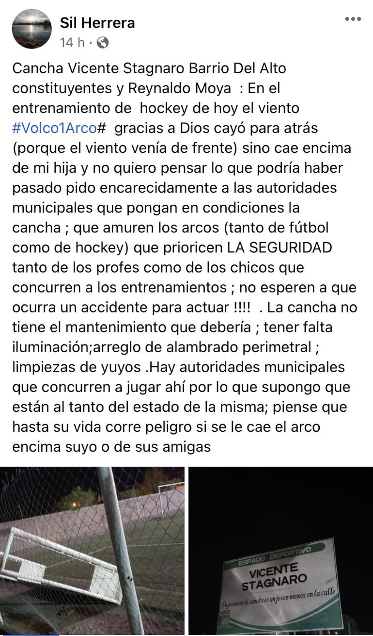 Silvana Herrera, la mamá de una de las jugadoras hizo pública la situación en su cuenta de Facebook y llamó a las autoridades municipales a que “pongan en condiciones la cancha”.