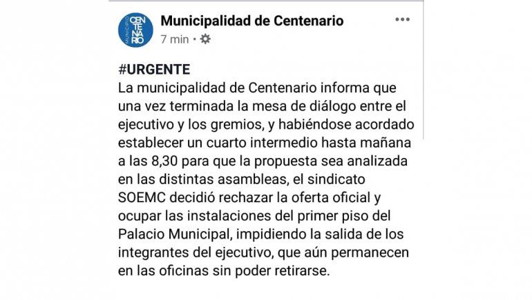 Momentos de tensión se vivieron en los primeros minutos del viernes en la municipalidad de Centenario, donde la Policía debió montar un dispositivo de seguridad para que el presidente del Deliberante, Cristian Pieroni, a cargo del Ejecutivo, la secretaria de Gobierno, Tanya Bertoldi, y varios colaboradores pudieran salir del edificio comunal. Desde minutos antes de las 19 del jueves, los empleados municipales, nucleados en el el Sindicato de Obreros y Empleados Municipales de Centenario (Soemc) coparon el lugar, en rechazo a la propuesta salarial.