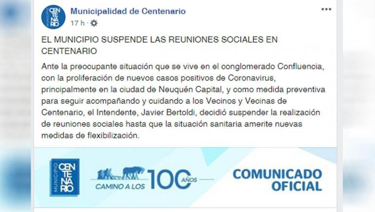El anuncio fue realizado a través de un comunicado y explicaron que la decisión surge "como medida preventiva para seguir acompañando y cuidando a los vecinos y vecinas de Centenario" y "ante la preocupante situación que se vive en el conglomerado Confluencia, con la proliferación de nuevos casos positivos de Coronavirus, principalmente en la ciudad de Neuquén Capital".