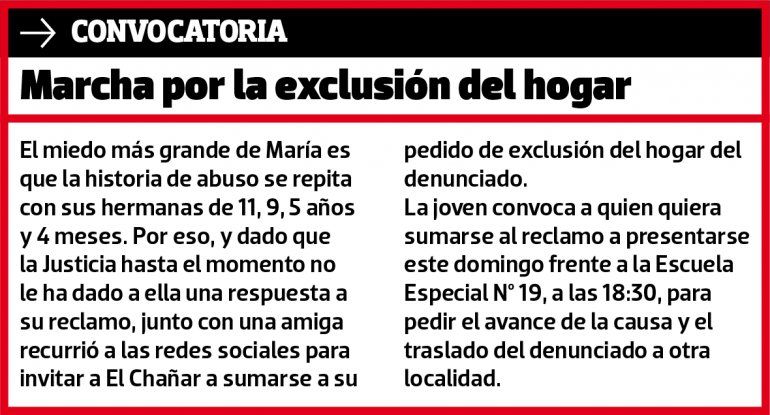 El miedo más grande de María es que la historia de abuso se repita con sus hermanas de 11, 9, 5 años y 4 meses. Por eso, y dado que la Justicia hasta el momento no le ha dado a ella una respuesta a su reclamo, junto con una amiga recurrió a las redes sociales para invitar a El Chañar a sumarse a su pedido de exclusión del hogar del denunciado.
