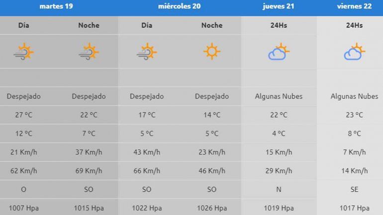 Para mañana lunes se espera una máxima de 29 y una mínima de 9, sin vientos y con un cielo despejado, una jornada perfecta para quienes disfrutan del clima primaveral y de la naturaleza. Si bien el martes la temperatura máxima alcanzará los 27 grados, la mínima será de 7 y habrá vientos de hasta 69 kilómetros por hora por la tarde.